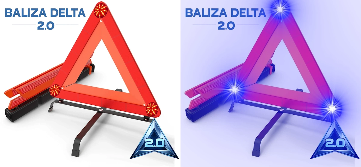 La Baliza Delta 2.0, llamada así por su forma, mantiene el tradicional triángulo e incluye los mismos mecanismos de aviso a DGT que la Baliza V19
